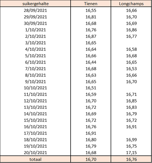 Bijna één derde van de campagne is afgewerkt, spijtig genoeg met ontgoochelende resultaten wat het suikergehalte (met gemiddeld 16,79° in Tienen) betreft. TS hoopte te kunnen landen op 17,24° maar stelt nu bij tot 16,90°, één van de laagste suikergehaltes van de voorbije jaren.